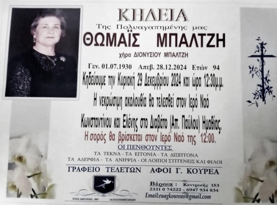 Κηδεύεται σήμερα Κυριακή 29 Δεκεμβρίου 2024 και ώρα 12,30 το μεσημέρι, ή Θωμαΐς, χήρα Διονυσίου, Μπαλτζή, 94 ετών. Η νεκρώσιμη ακολουθία θα τελεσθεί στον Ιερό Ναό των Αγίων Κωνσταντίνου και Ελένης στον Διαβατό Δήμου Βέροιας.