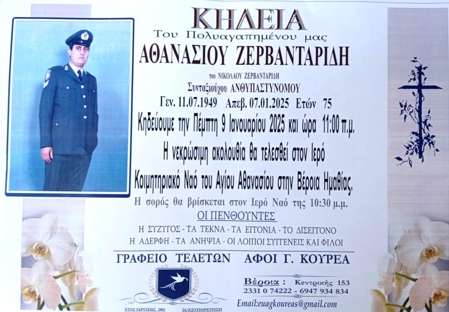 Κηδεύεται την Πέμπτη 9 Ιανουαρίου 2025 και ώρα 11,00 το πρωί, ο Αθανάσιος, Νικολάου, Ζερβανταρίδης, 75 ετών. Η νεκρώσιμη ακολουθία θα τελεσθεί στον Ιερό Ναό Αγίου Αθανασίου (Κοιμητήρια) στη Βέροια. Η σορός θα βρίσκεται στον Ιερό Ναό στις 10.30 π.μ..