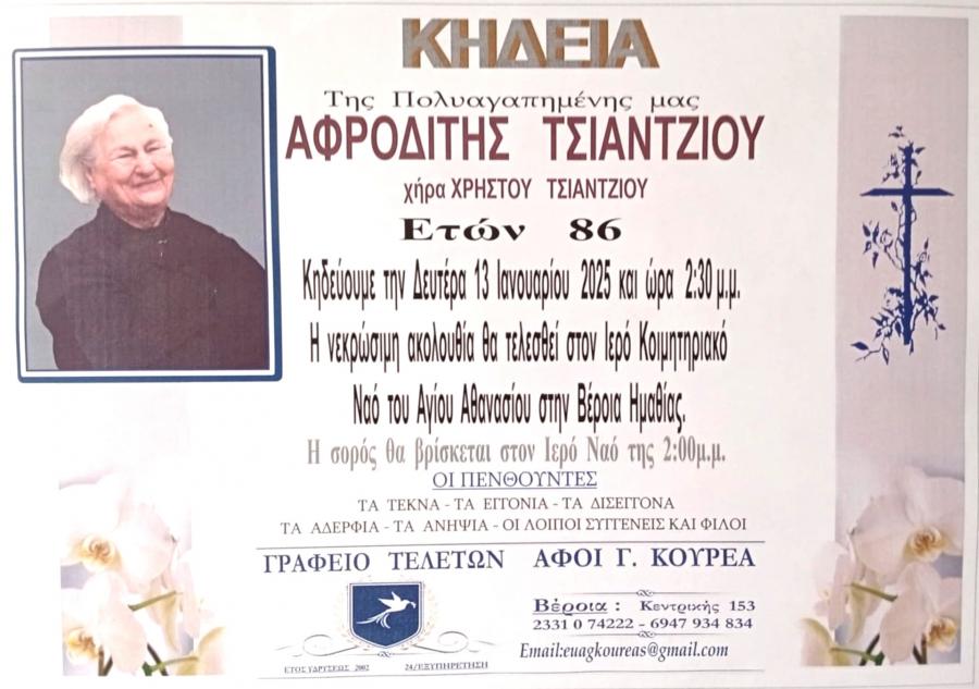 Κηδεύεται σήμερα Δευτέρα 13 Ιανουαρίου 2025 και ώρα 2,30 το μεσημέρι, η Αφροδίτη, χήρα Χρήστου, Τσιάντζιου, 86 ετών. Η νεκρώσιμη ακολουθία θα τελεσθεί στον Ιερό Ναό Αγίου Αθανασίου (Κοιμητήρια) στη Βέροια.