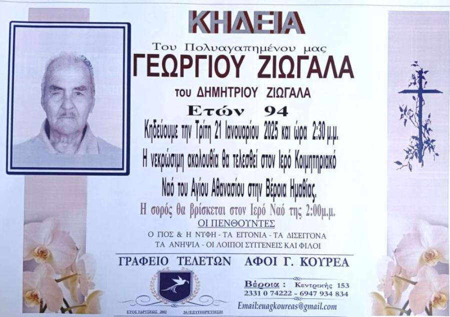 Κηδεύεται σήμερα Τρίτη 21 Ιανουαρίου 2025 και ώρα 2.30 το μεσημέρι, ο Γεώργιος, Δημητρίου, Ζιώγαλας, 94 ετών. Η νεκρώσιμη ακολουθία θα τελεσθεί στον Ιερό Ναό Αγίου Αθανασίου (Κοιμητήρια) στη Βέροια. Η σορός θα βρίσκεται στον Ιερό Ναό στις 2.00 μ.μ.