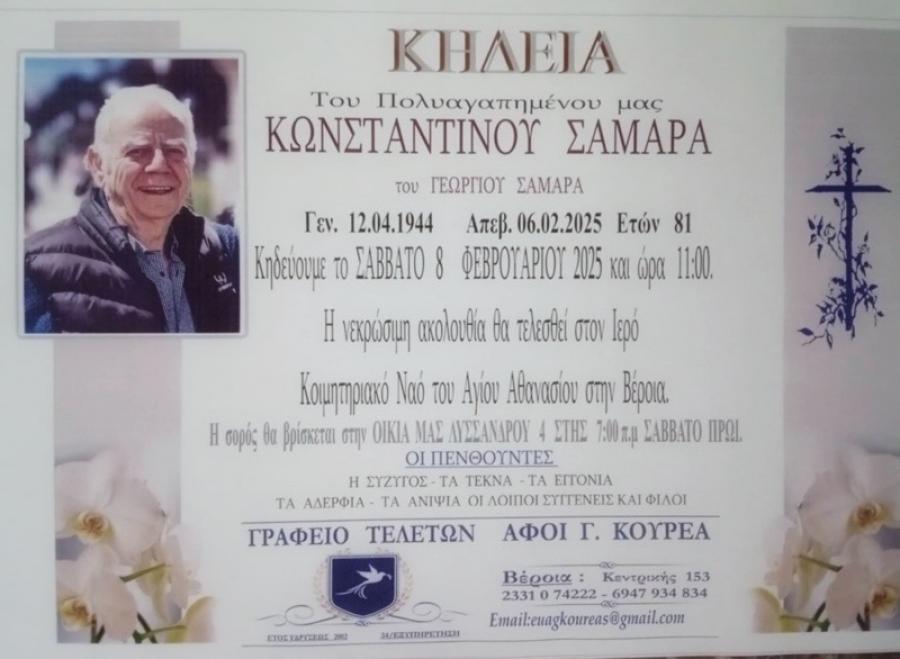 Κηδεύεται το Σάββατο 8 Φεβρουαρίου 2025 και ώρα 11 το πρωί, ο Κωνσταντίνος, Γεωργίου, Σαμαράς 81 ετών. Η νεκρώσιμη ακολουθία θα τελεσθεί στον Ιερό Ναό Αγίου Αθανασίου (Κοιμητήρια) στη Βέροια.