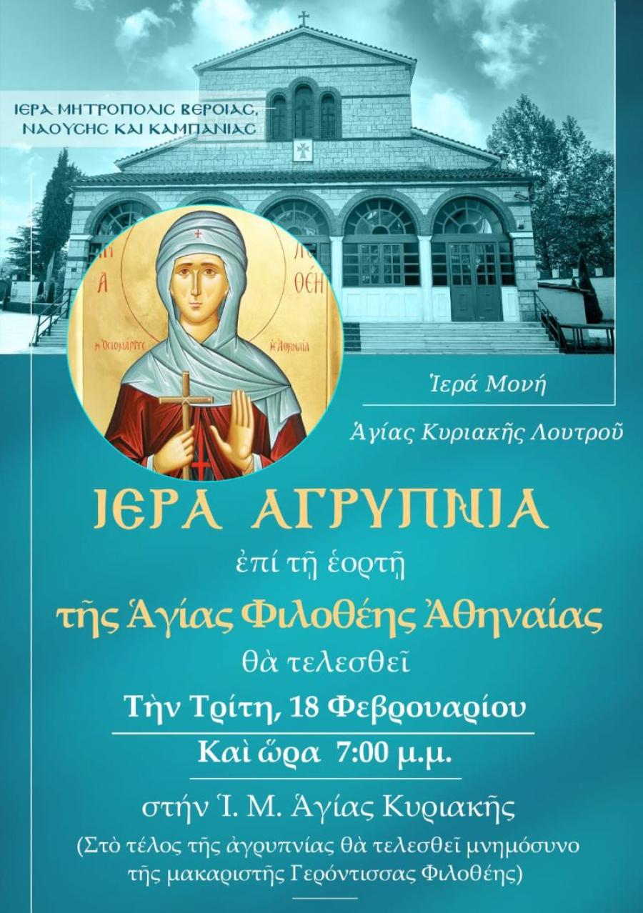 Ιερά Αγρυπνία την Τρίτη 18 Φεβρουαρίου 2025 στις 19:00, θα τελεσθεί με αφορμή την μνήμη της Αγίας Φιλοθέης της Αθηναίας στην Ιερά Μονή Αγίας Κυριακής Λουτρού. Στο τέλος της αγρύπνιας θα τελεσθεί επιμνημόσυνη δέηση στη μνήμη της Μακαριστής Γερόντισσας Φιλοθέης, του ανθρώπου που αγωνίσθηκε με ζήλο και αυταπάρνηση και δημιούργησε από ένα μικρό προσκύνημα που προϋπήρχε, την περίλαμπρη Ιερά Μονή της Αγίας Μεγαλομάρτυρος Κυριακής.
