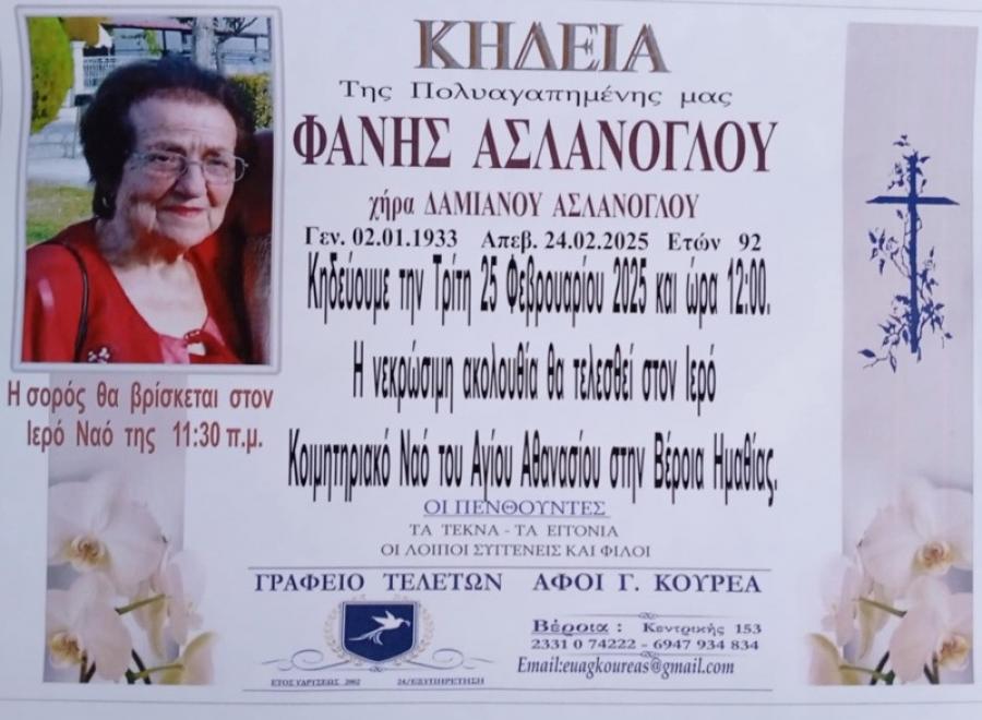 Κηδεύεται αύριο Τρίτη 25 Φεβρουαρίου 2025 και ώρα 12.00 το μεσημέρι, η Φανή, χήρα Δαμιανού, Ασλάνογλου, 92 ετών. Η νεκρώσιμη ακολουθία θα τελεσθεί στον Ιερό Ναό του Αγίου Αθανασίου (Κοιμητήρια) στη Βέροια.