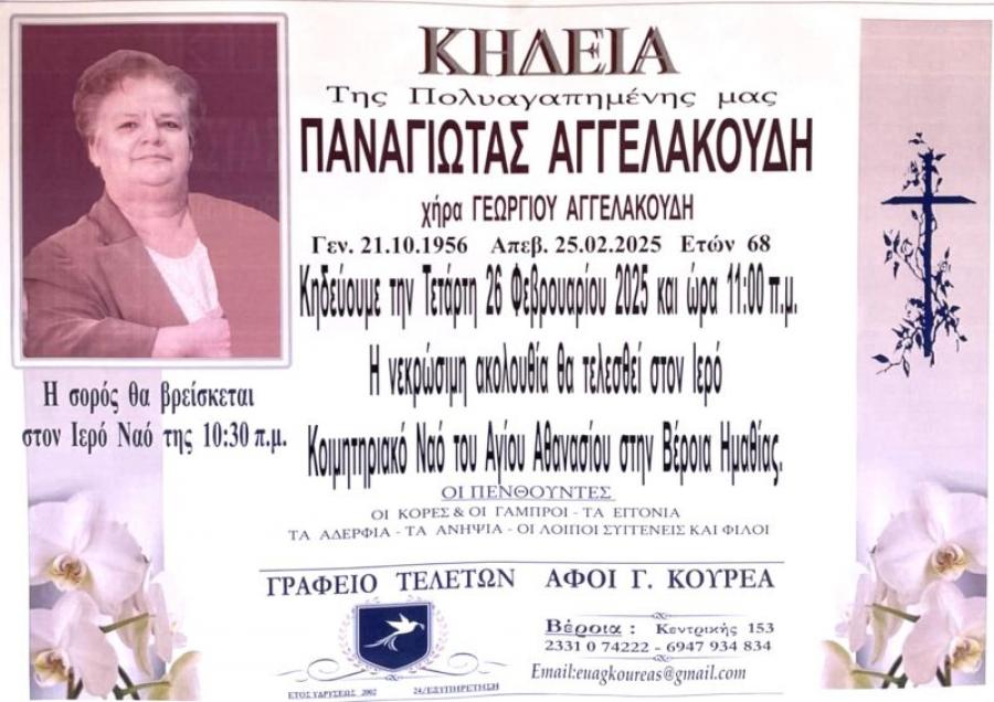 Κηδεύεται αύριο Τετάρτη 26 Φεβρουαρίου 2025 και ώρα 11.00 το πρωί, η Παναγιώτα, χήρα Γεωργίου, Αγγελακούδη, 68 ετών. Η νεκρώσιμη ακολουθία θα τελεσθεί στον Ιερό Ναό του Αγίου Αθανασίου (Κοιμητήρια) στη Βέροια.
