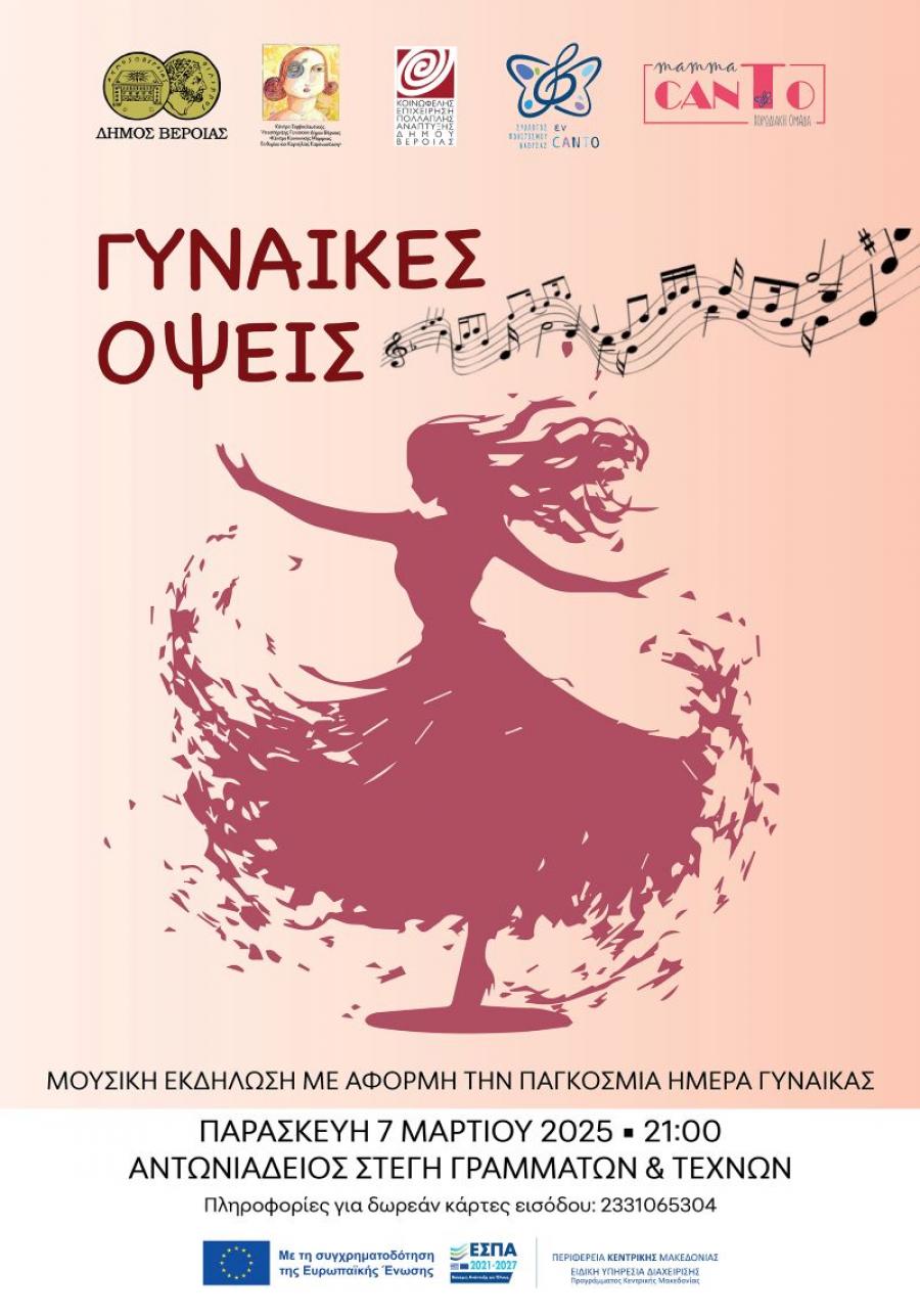 Το Συμβουλευτικό Κέντρο Γυναικών Δήμου Βέροιας, σε συνεργασία με τον Σύλλογο Πολιτισμού Νάουσας ενCANTO και την ΚΕΠΑ Δήμου Βέροιας, τιμούν την Παγκόσμια Ημέρα για τη Γυναίκα, 8 Μαρτίου και σας προσκαλούν την Παρασκευή 7 Μαρτίου και ώρα 21:00 στην Αντωνιάδειο Στέγη Γραμμάτων και Τενχών στην καλλιτεχνική δράση με τίτλο: «Γυναίκες - Όψεις», σε μια βραδιά με γυναικείο άρωμα.