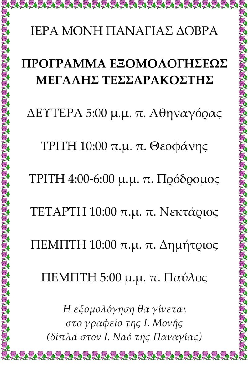 Το πρόγραμμα εξομολογήσεων στην Ι. Μ. Παναγίας Δοβρά