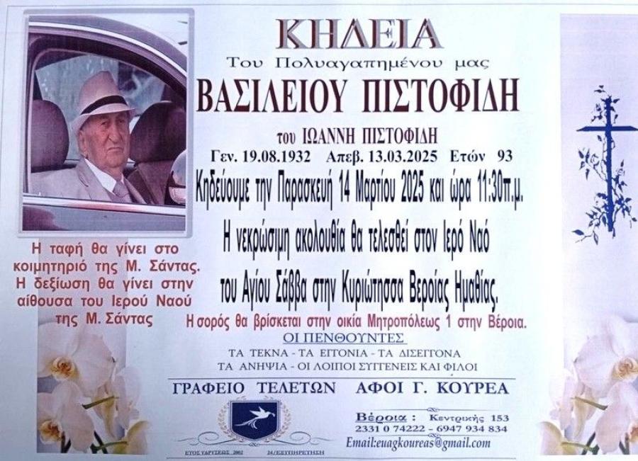 Κηδεύεται την Παρασκευή 14 Μαρτίου 2025 και ώρα 11.30 το πρωί, ο Βασίλειος, Ιωάννη, Πιστοφίδης, 93 ετών. Η νεκρώσιμη ακολουθία θα τελεσθεί στον Ιερό Ναό του Αγίου Σάββα, στην Κυριώτισσα Βέροιας.