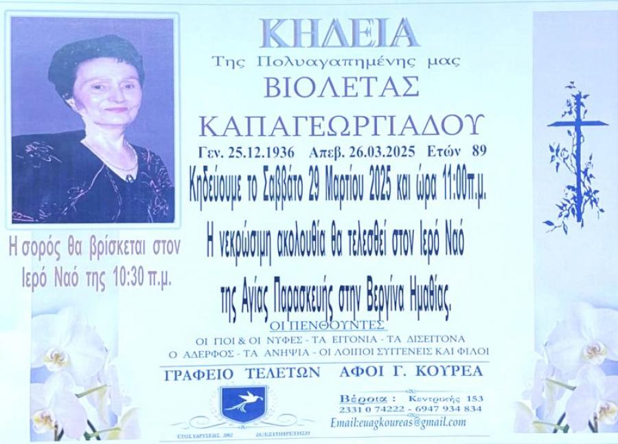 Κηδεύεται αύριο Σάββατο 29 Μαρτίου 2025 και ώρα 11.00 το πρωί, η Βιολέτα Καπαγεωργιάδου, 89 ετών. Η νεκρώσιμη ακολουθία θα τελεσθεί στον Ιερό Ναό της Αγίας Παρασκευής στη Βεργίνα Δήμου Βέροιας. Η σορός θα βρίσκεται στον Ιερό Ναό στις 10.30 π.μ..