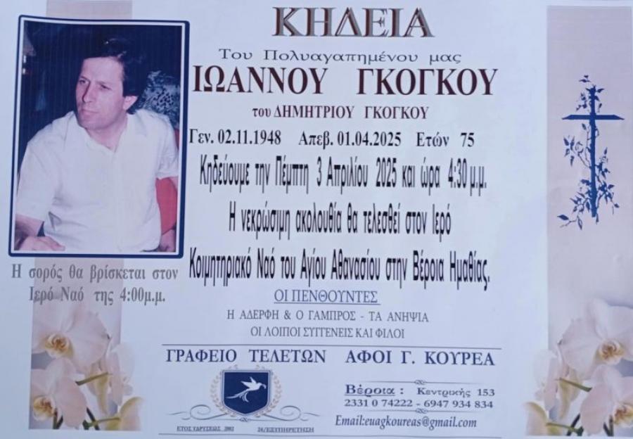 Κηδεύεται αύριο Πέμπτη 03 Απριλίου 2025 και ώρα 4.30 το απόγευμα, ο Ιωάννης, Δημητρίου, Γκόγκος, 75 ετών. Η νεκρώσιμη ακολουθία θα τελεσθεί στον Ιερό Ναό του Αγίου Αθανασίου (Κοιμητήρια), στη Βέροια. Η σορός θα βρίσκεται στον Ιερό Ναό στις 4.00 μ.μ.