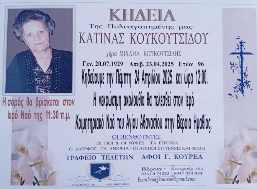 Κηδεύεται σήμερα Πέμπτη 24 Απριλίου 2025 και ώρα 12.00 το μεσημέρι, η Κατίνα, χήρα Μιχαήλ, Κουκουτσίδου, 96 ετών. Η νεκρώσιμη ακολουθία θα τελεσθεί στον Ιερό Ναό του Αγίου Αθανασίου (Κοιμητήρια), στη Βέροια.