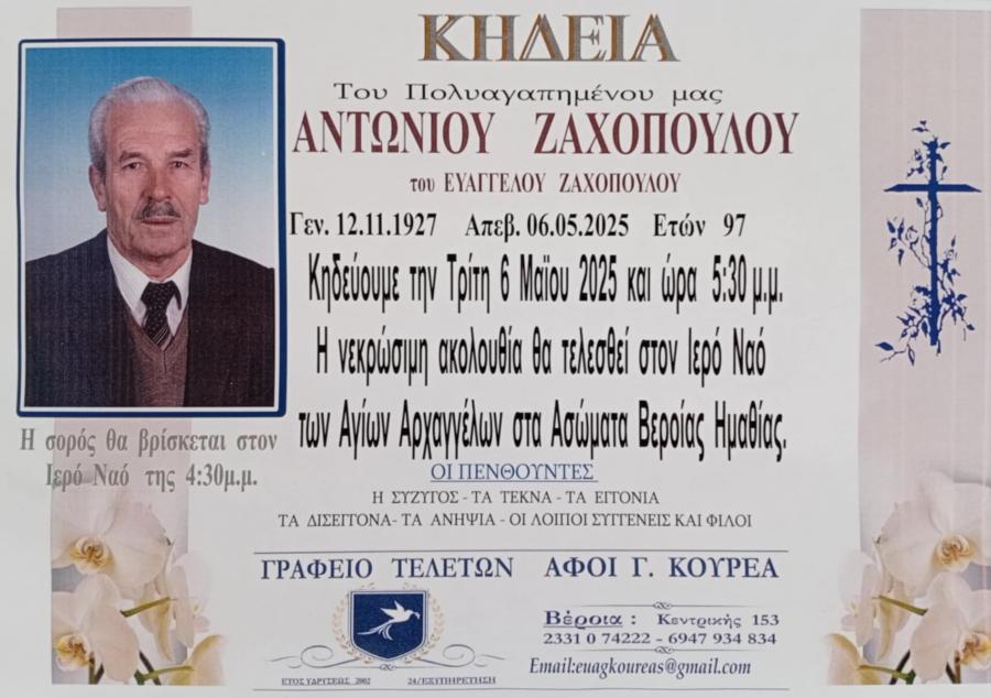 Κηδεύεται σήμερα Τρίτη 6 Μαΐου 2025 και ώρα 5,30 το απόγευμα, ο Αντώνιος, Ευαγγέλου, Ζαχόπουλος, 97 ετών. Η νεκρώσιμη ακολουθία θα τελεσθεί στον Ιερό Ναό των Αγίων Αρχαγγέλων, στα Ασώματα Δήμου Βέροιας.