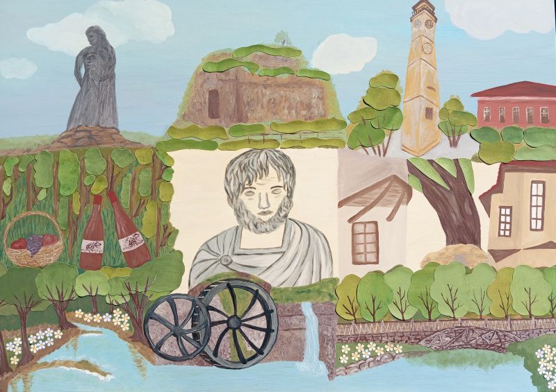 Φέτος οι ωφελούμενοί μας, με την καθοδήγηση της εικαστικού κας. Ελένης Σταμένου, δημιούργησαν ένα έργο εμπνευσμένο από τα αξιοθέατα και τις φυσικές ομορφιές της Νάουσας, πάντα σε συνάφεια με το θέμα της έκθεσης.