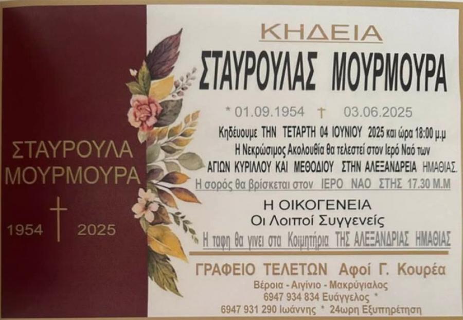Κηδεύεται σήμερα Τετάρτη 4 Ιουνίου 2025 και ώρα 6.00 το απόγευμα, η Σταυρούλα Μουρμουρά, 71 ετών. Η νεκρώσιμη ακολουθία θα τελεσθεί στον Ιερό Ναό των Αγίων Κυρίλλου και Μεθοδίου, στην Αλεξάνδρεια. Η σορός θα βρίσκεται στον Ιερό Ναό στις 5,30 μ.μ.