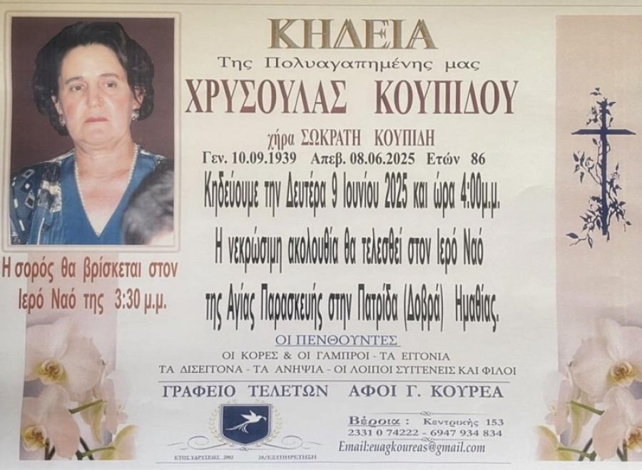 Κηδεύεται σήμερα Δευτέρα 9 Ιουνίου 2025 και ώρα 4.00 το απόγευμα, η Χρυσούλα, χήρα Σωκράτη, Κουπίδου, 86 ετών. Η νεκρώσιμη ακολουθία θα τελεσθεί στον Ιερό Ναό της Αγίας Παρασκευής, στην Πατρίδα Δήμου Βέροιας.