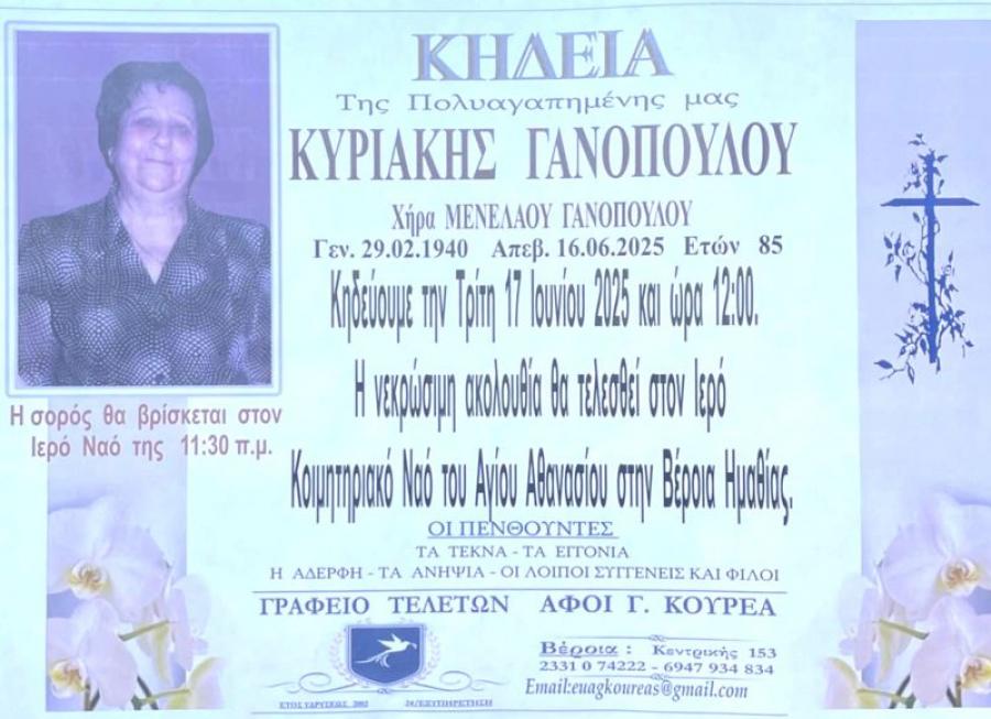 Κηδεύεται σήμερα Τρίτη 17 Ιουνίου 2025 και ώρα 12.00 το μεσημέρι, η Κυριακή, χήρα Μενελάου, Γανοπούλου, 85 ετών. Η νεκρώσιμη ακολουθία θα τελεσθεί στον Ιερό Ναό του Αγίου Αθανασίου (Κοιμητήρια), στη Βέροια.
