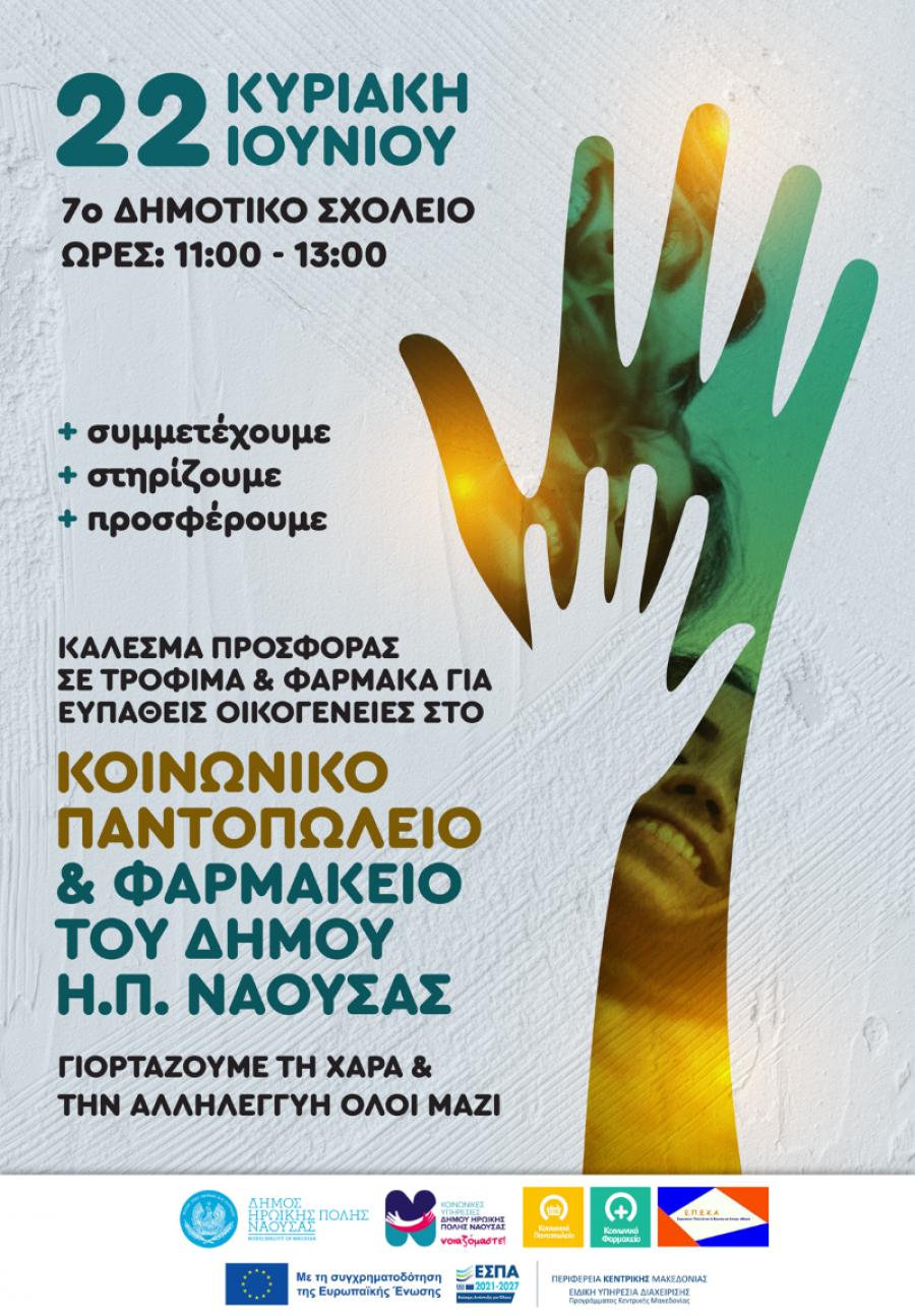 Ο Δήμος Ηρωικής Πόλης Νάουσας απευθύνει κάλεσμα στους πολίτες να συμμετάσχουν ενεργά σε μια ανοιχτή κοινωνική δράση, την Κυριακή 22 Ιουνίου 2025, με στόχο τη στήριξη των ευάλωτων κοινωνικών ομάδων μέσω του Κοινωνικού Παντοπωλείου και του Κοινωνικού Φαρμακείου.