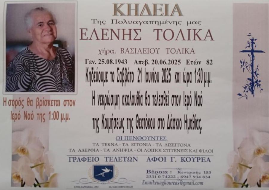 Κηδεύεται αύριο Σάββατο 21 Ιουνίου 2025 και ώρα 1.30 το μεσημέρι, η Ελένη, χήρα Βασιλείου, Τολίκα, 82 ετών. Η νεκρώσιμη ακολουθία θα τελεσθεί στον Ιερό Ναό της Κοιμήσεως της Θεοτόκου, στο Δάσκιο Δήμου Βέροιας.