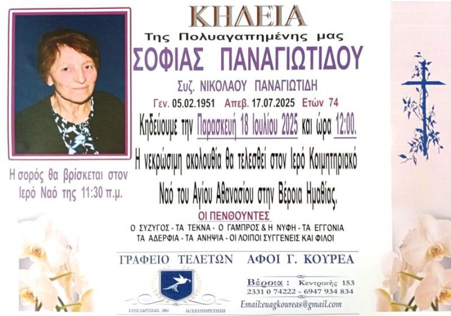 Κηδεύεται αύριο Παρασκευή 18 Ιουλίου 2025 και ώρα 12.00 το μεσημέρι, η Σοφία, σύζ. Νικολάου, Παναγιωτίδου, 74 ετών. Η νεκρώσιμη ακολουθία θα τελεσθεί στον Ιερό Ναό του Αγίου Αθανασίου (Κοιμητήρια), στη Βέροια.