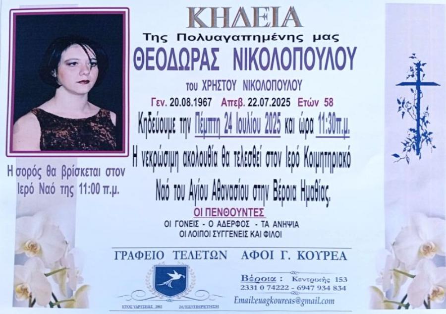 Κηδεύεται αύριο Πέμπτη 24 Ιουλίου 2025 και ώρα 11.30 το πρωί, η Θεοδώρα, Χρήστου, Νικολοπούλου, 58 ετών. Η νεκρώσιμη ακολουθία θα τελεσθεί στον Ιερό Ναό του Αγίου Αθανασίου (Κοιμητήρια), στη Βέροια. Η σορός θα βρίσκεται στον Ιερό Ναό στις 11.00 π.μ.
