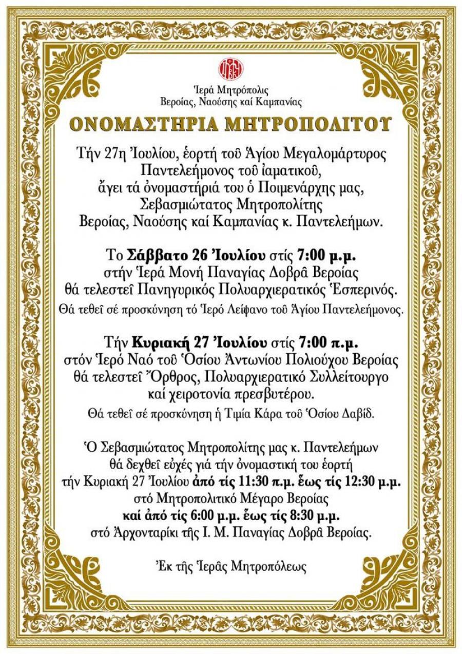 Ὁ Σεβασμιώτατος Μητροπολίτης μας κ. Παντελεήμων θά δεχθεῖ εὐχές γιά τήν ὀνομαστική του ἑορτή τήν Κυριακή 27 Ἰουλίου ἀπό τίς 11:30 π.μ. ἕως τίς 12:30 μ.μ. στό Μητροπολιτικό Μέγαρο Βεροίας καί ἀπό τίς 6:00 μ.μ. ἕως τίς 8:30 μ.μ. στό Ἀρχονταρίκι τῆς Ι. Μ. Παναγίας Δοβρᾶ Βεροίας.