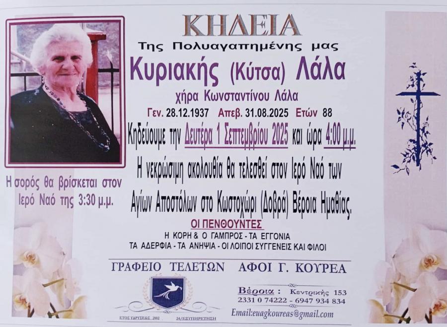 Κηδεύεται σήμερα Δευτερα 01 Σεπτεμβρίου 2025 και ώρα 4.00 το απόγευμα, η Κυριακή (Κίτσα), χήρα Κωνσταντίνου, Λάλα, 88 ετών. Η νεκρώσιμη ακολουθία θα τελεσθεί στον Ιερό Ναό των Αγίων Αποστόλων στο Κωστοχώρι Δήμου Βέροιας.
