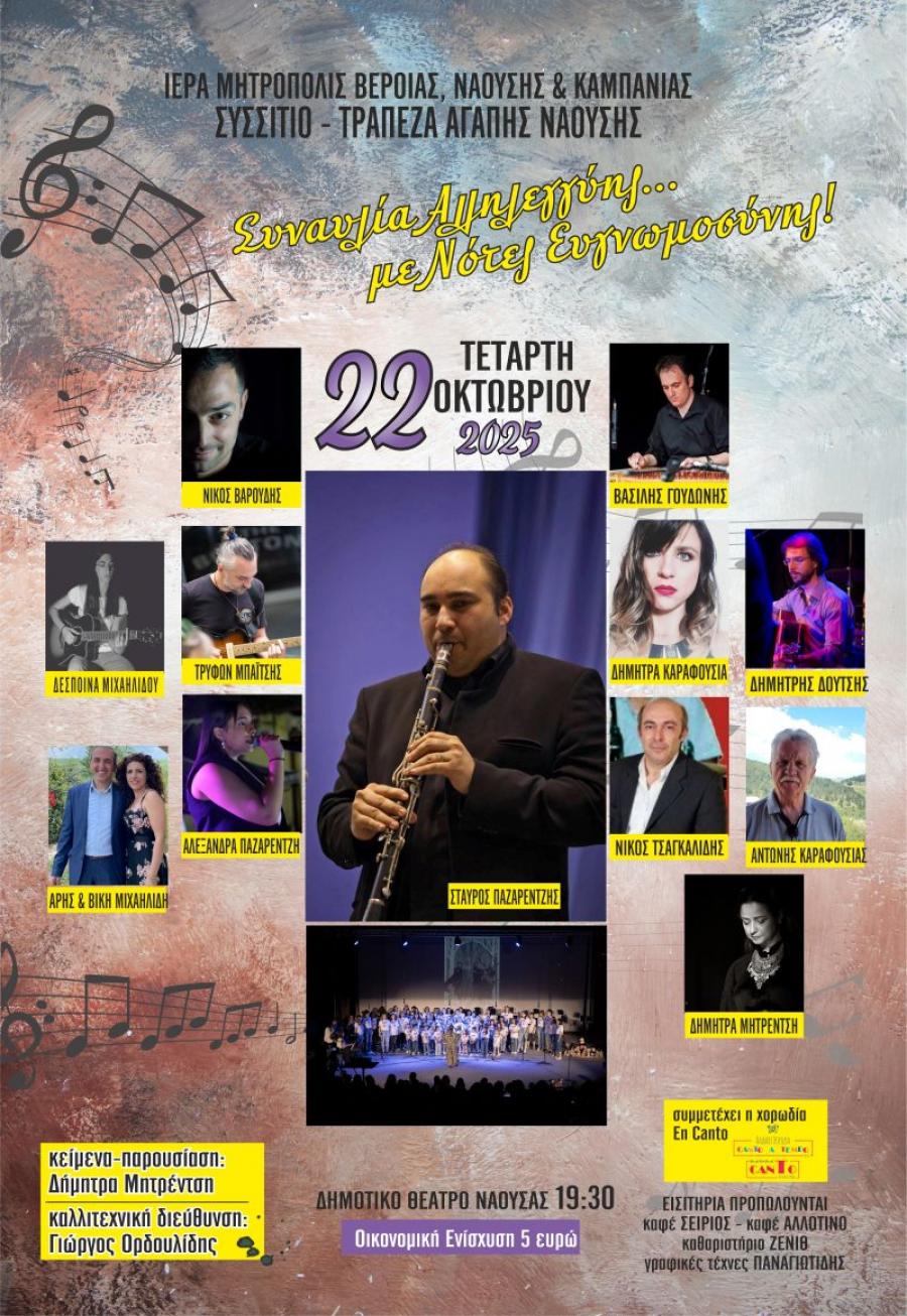 Η Συναυλία θα πραγματοποιηθεί την Τετάρτη 22 Οκτωβρίου 2025 και ώρα 7:30 μ.μ. στο Δημοτικό Θέατρο Νάουσας με τη συμμετοχή σπουδαίων τοπικών καλλιτεχνών.