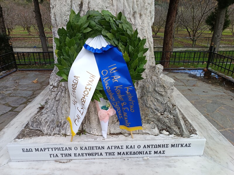 Στο μνημείο, μαθητές μέλη του κατηχητικού, ανέγνωσαν το ιστορικό της δράσης του Καπετάν Άγρα και του Αντώνη Μίγκα και κατέθεσαν στεφάνι στο τσιμεντένιο ομοίωμα του δένδρου της Καρυδιάς, σε κλαδί της οποίας οι Βούλγαροι Κομιτατζήδες απαγχόνισαν τα δύο παλικάρια ύστερα από την ύπουλη σύλληψή τους.