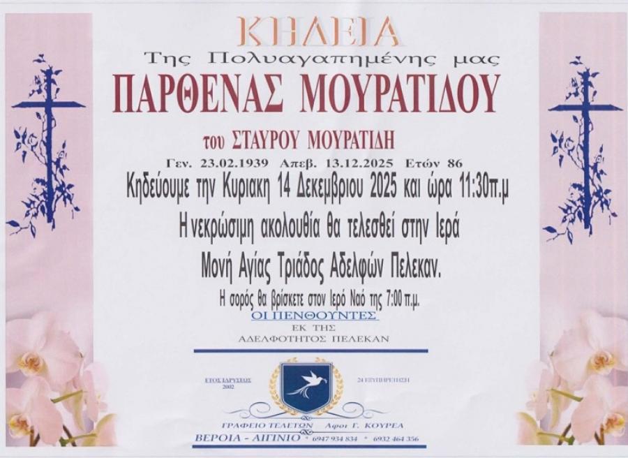 Κηδεύεται σήμερα Κυριακή 14 Δεκεμβρίου 2025 και ώρα 11.30 το πρωί, η Παρθένα, Σταύρου, Μουρατίδου, 86 ετών. Η νεκρώσιμη ακολουθία θα τελεσθεί στον Ιερά Μονή Αγίας Τριάδας Αδελφών Πέλεκαν. Η σορός θα βρίσκεται στον Ιερό Ναό ώρα 7.00 π.μ.