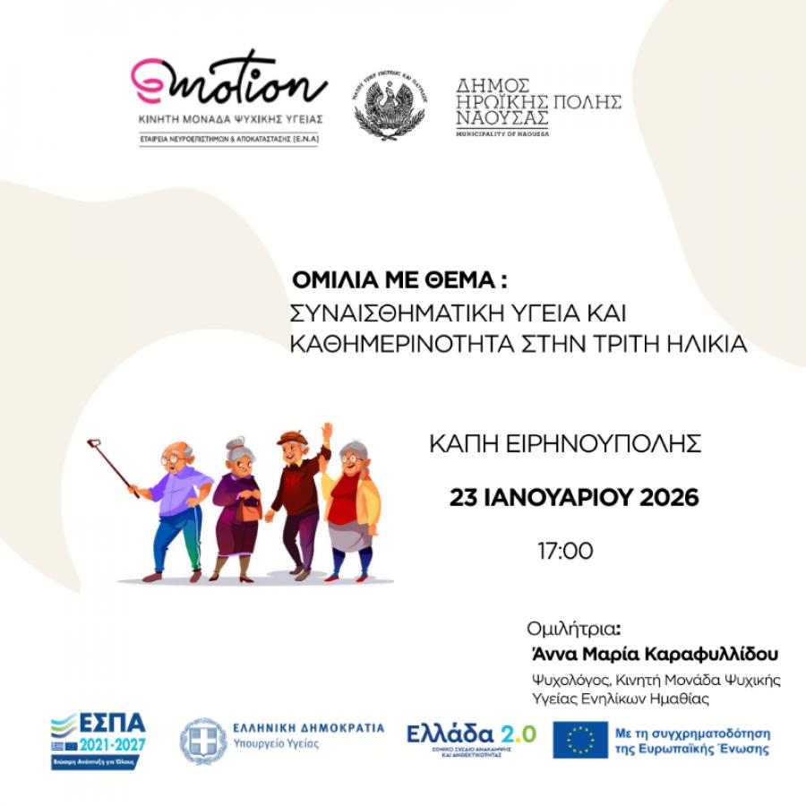 Στο πλαίσιο της ενημέρωσης και της ευαισθητοποίησης των πολιτών σε ζητήματα που αφορούν την ψυχική υγεία και την ποιότητα ζωής των ατόμων μεγαλύτερης ηλικίας, το Τμήμα Κοινωνικής Προστασίας, Εθελοντισμού και Αλληλεγγύης του Δήμου Ηρωικής Πόλεως Νάουσας, σε συνεργασία με το ΚΑΠΗ Ειρηνούπολης Νάουσας και την Κινητή Μονάδα Ψυχικής Υγείας Ημαθίας, διοργανώνει ενημερωτική ομιλία με θέμα: «Συναισθηματική Υγεία και Κοινωνικοποίηση στην Τρίτη Ηλικία».