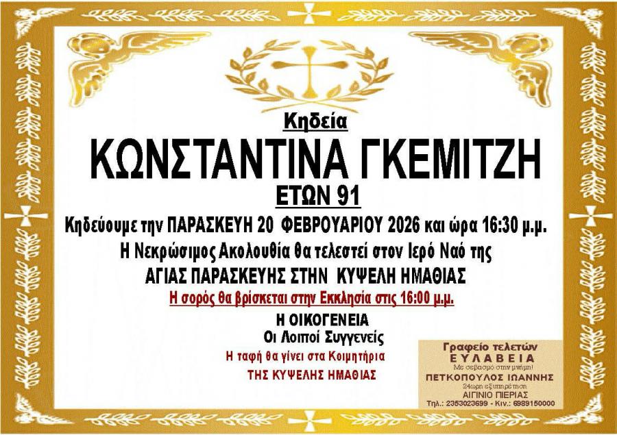 Κηδεύεται σήμερα Παρασκευή 20 Φεβρουαρίου 2026 και ώρα 4.30 το απόγευμα, η Κωνσταντίνα Γκεμιτζή, 91 ετών. Η νεκρώσιμη ακολουθία θα τελεσθεί στον Ιερό Ναό Αγίας Παρασκευής στην Κυψέλη Ημαθίας. Η σορός θα βρίσκεται στην εκκλησία ώρα 4.00 μ.μ.