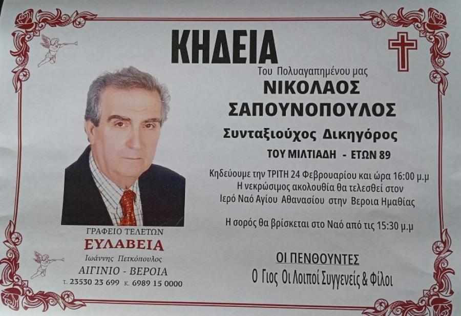 Κηδεύεται την Τρίτη 24 Φεβρουαρίου 2026 και ώρα 4.00 το απόγευμα, ο συνταξιούχος δικηγόρος Νικόλαος Σαπουνόπουλος, 89 ετών. Η νεκρώσιμη ακολουθία θα τελεσθεί στον Ιερό Ναό Αγίου Αθανασίου (Κοιμητήρια) στη Βέροια.
