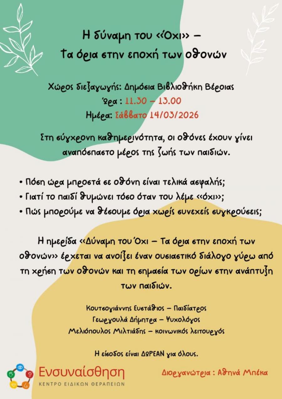 Η ημερίδα «Δύναμη του Όχι – Τα όρια στην εποχή των οθονών» έρχεται να ανοίξει έναν ουσιαστικό διάλογο γύρω από τη χρήση των οθονών και τη σημασία των ορίων στην ανάπτυξη των παιδιών.