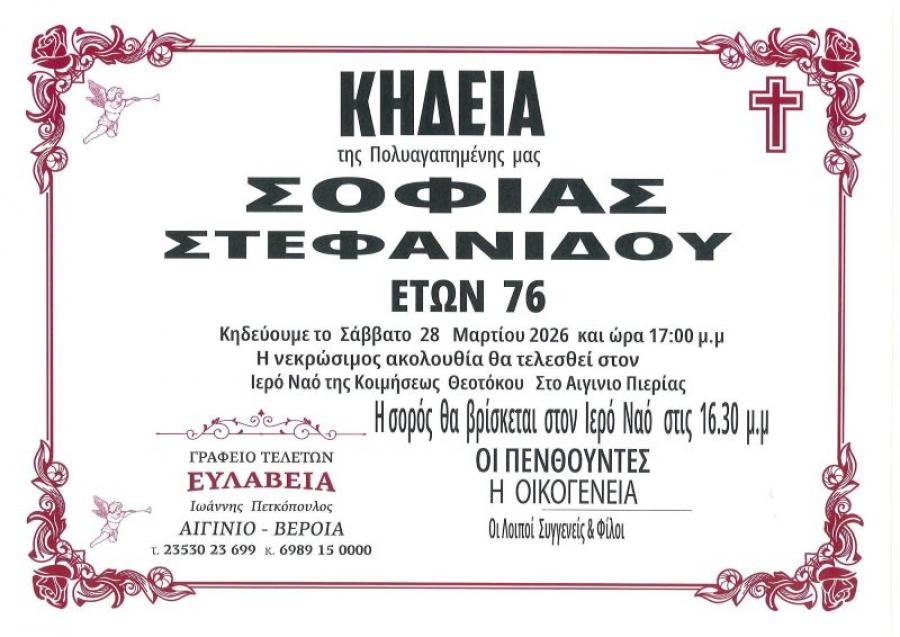 Κηδεύεται αύριο Σάββατο 28 Μαρτίου 2026 και ώρα 5.00 το απόγευμα, η Σοφία Στεφανίδου, 76 ετών. Η νεκρώσιμη ακολουθία θα τελεσθεί στον Ιερό Ναό της Κοιμήσεως της Θεοτόκου στο Αιγίνιο Πιερίας. Η σορός θα βρίσκεται στον Ιερό Ναό στις 4.30 μ.μ.