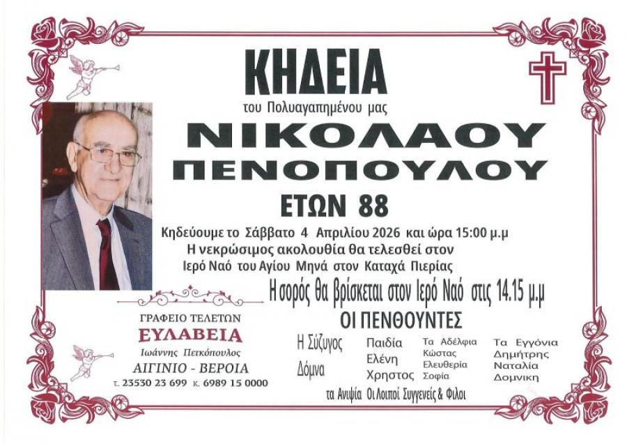 Κηδεύεται το Σάββατο 04 Απριλίου 2026 και ώρα 3.00 το μεσημέρι, ο Νικόλαος Πενόπουλος, 88 ετών. Η νεκρώσιμη ακολουθία θα τελεσθεί στον Ιερό Ναό του Αγίου Μηνά στον Καταχά Πιερίας. Η σορός θα βρίσκεται στον Ιερό Ναό στις 2.15 μ.μ.
