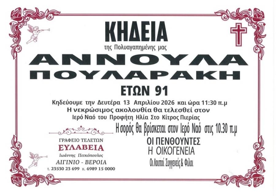 Κηδεύεται σήμερα Δευτέρα 13 Απριλίου 2026 και ώρα 11.30 το πρωί, η Αννούλα Πουλαράκη, 91 ετών. Η νεκρώσιμη ακολουθία θα τελεσθεί στον Ιερό Ναό Προφήτου Ηλία στο Κίτρος Πιερίας. Η σορός θα βρίσκεται στον Ιερό Ναό στις 10.30 π.μ.