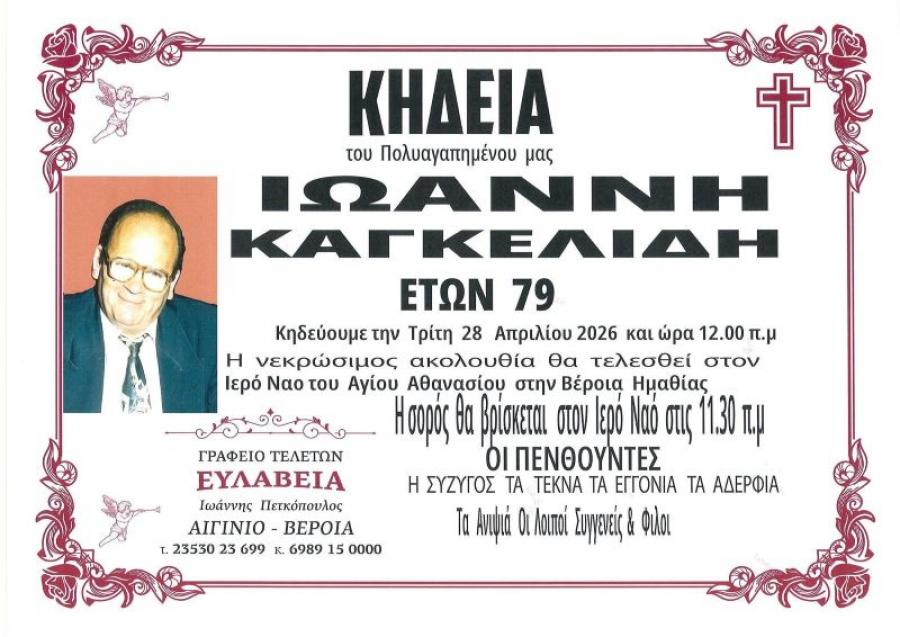 Κηδεύεται σήμερα Τρίτη Δευτέρα 28 Απριλίου 2026 και ώρα 12 το μεσημέρι, ο Ιωάννης Καγκελίδης, 79 ετών. Η νεκρώσιμη ακολουθία θα τελεσθεί στον Ιερό Ναό του Αγίου Αθανασίου (Κοιμητήρια) στη Βέροια. Η σορός θα βρίσκεται στον Ιερό Ναό στις 11.30 π.μ.