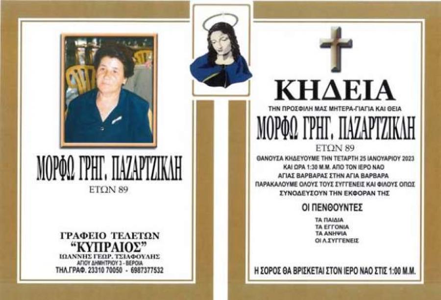 Κηδεύεται αύριο Τετάρτη 25 Ιανουαρίου 2023 και ώρα 1.30 το μεσημέρι, η Μόρφω, Γρηγ., Παζαρτζικλή, 89 ετών. Η νεκρώσιμη ακολουθία θα τελεσθεί στον Ιερό Ναό Αγίας Βαρβάρας στην Αγία Βαρβάρα Δήμου Βέροιας.
