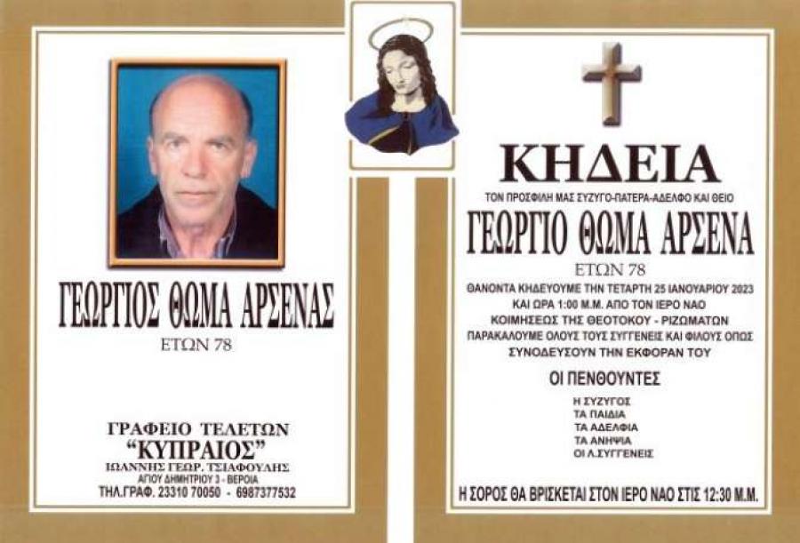 Κηδεύεται σήμερα Τετάρτη 25 Ιανουαρίου 2023 και ώρα 1.00 το μεσημέρι, ο Γεώργιος, Θωμά, Αρσενάς, 78 ετών. Η νεκρώσιμη ακολουθία θα τελεσθεί στον Ιερό Ναό Κοιμήσεως της Θεοτόκου στα Ριζώματα Δήμου Βέροιας.