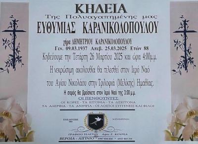 Κηδεύεται σήμερα Τετάρτη 26 Νοεμβρίου 2025 και ώρα 2,30 το μεσημέρι, η Αναστασία, χήρα Γεωργίου, Τηλαβερίδου, 84 ετών. Η νεκρώσιμη ακολουθία θα τελεσθεί στον Ιερό Ναό του Αγίου Νικολάου στην Κουμαριά Δήμου Βέροιας. Η σορός θα βρίσκεται στην οικία μας στην Κουμαριά.