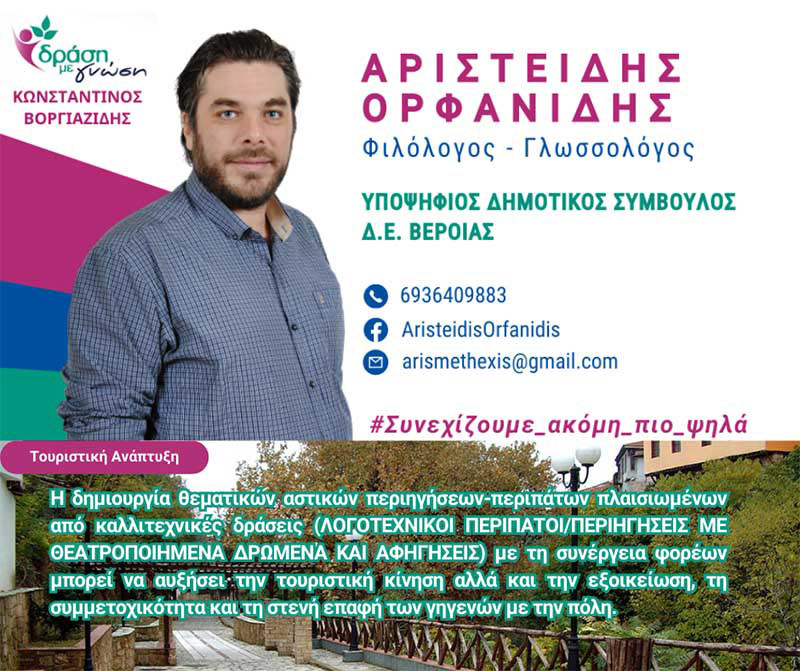 Σας ανακοινώνω με ενθουσιασμό και υψηλό αίσθημα ευθύνης την υποψηφιότητά μου για το τιμητικό αξίωμα του δημοτικού συμβούλου στο πλευρό του δημάρχου Κώστα Βοργιαζίδη για μια Βέροια με «Δράση με Γνώση» με την προοπτική ανάδειξής της σε πόλη-πρότυπο.