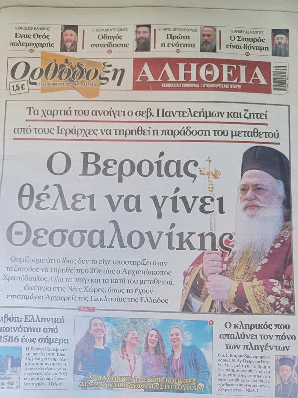 Φυσικά την μερίδα του λέοντος στα δημοσιεύματα του καθημερινού Τύπου κατέχει η διαδοχή στη Μητρόπολη Θεσσαλονίκης, καθώς η συγκεκριμένη εκκλησιαστική επαρχία έχει μεγάλο ειδικό βάρος τόσο γεω-πολιτικά, όσο και στα δρώμενα των Εκκλησιών της Βαλκανικής Χερσονήσου. Άλλωστε, για πολλούς αποτελεί την κορυφή της μητροπολιτικής πυραμίδας των λεγομένων «Νέων Χωρών», των Μητροπόλεων δηλαδή που ενώ εντάχθηκαν στην Εκκλησία της Ελλάδος μετά τους Βαλκανικούς Πολέμους του 1912-13, εν τούτοις μνημονεύουν ως ανώτατη Πνευματική Αρχή τον εκάστοτε Πατριάρχη Κωνσταντινουπόλεως, κατ’ εφαρμογήν της σχετικής Πατριαρχικής Πράξης του 1928.