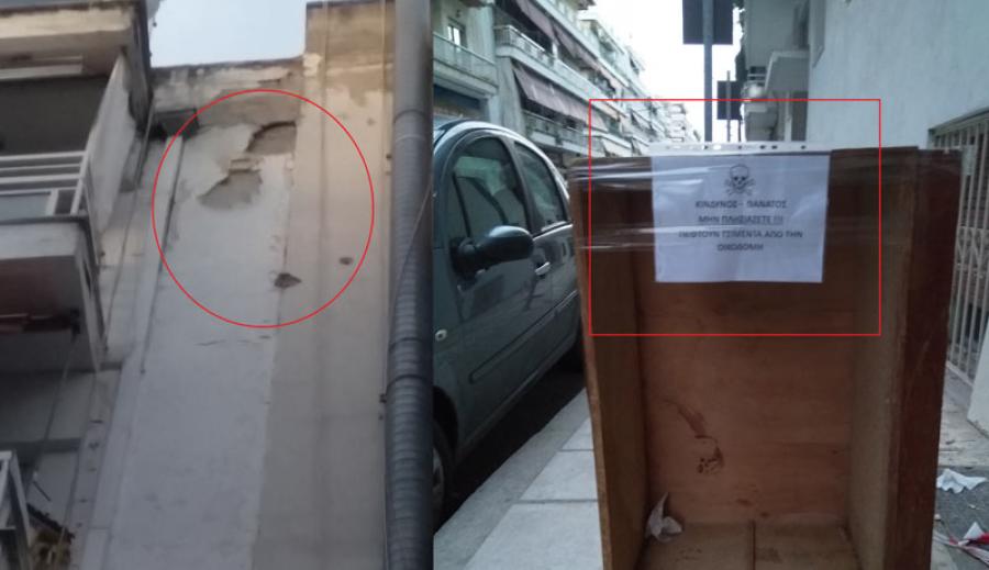 Όπως φαίνεται καθαρά στη φωτογραφία, επί της οδού Κωττουνίου 13 στη Βέροια, στο μεθόριο σχεδόν των πολυκατοικιών, σοβάδες αποκολλημένοι κρέμονται ετοιμόρροποι πάνω από το πεζοδρόμιο, με κίνδυνο να τραυματίσουν θανάσιμα περαστικούς και να καταστρέψουν παρκαρισμένα οχήματα.