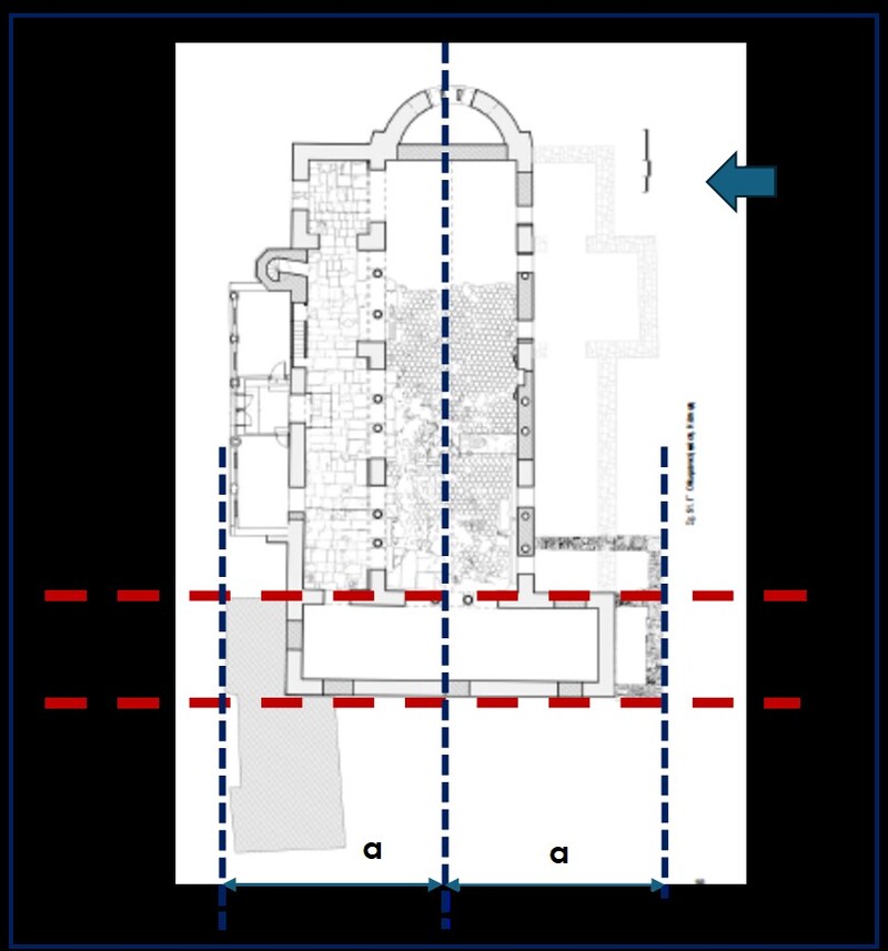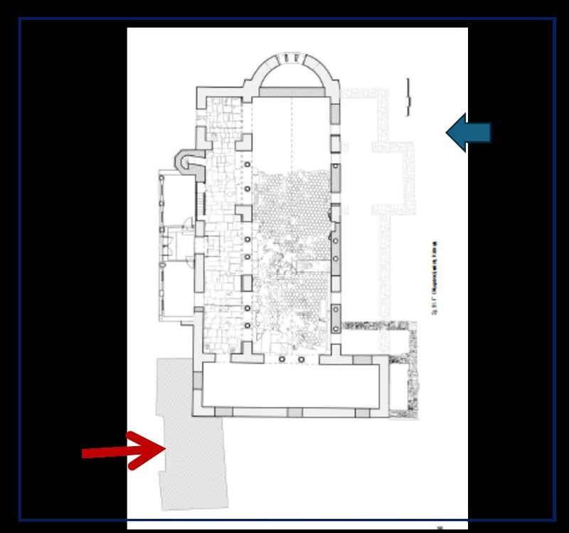 Σχ. 2.: Ο κεντρικός, διαμήκης άξονας του μνημείου και οι συμμετρικές του κατασκευές στα ΒΔ (‘προσκτίσματα’) και ΝΔ (Διακονικό / Επισκοπείο).