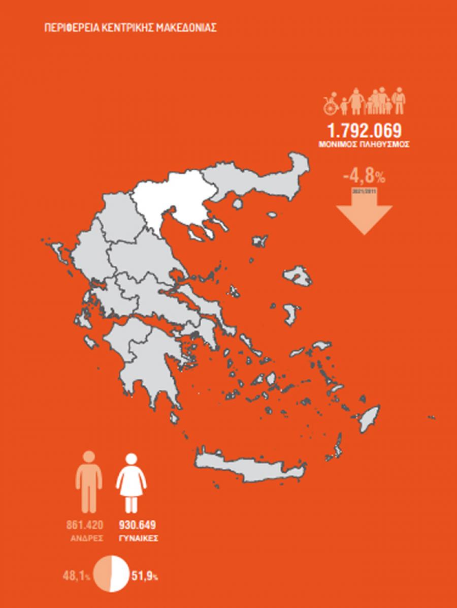 Ακολουθεί η Κεντρική Μακεδονία με 1.792.069 κατοίκους. Ο πληθυσμός της υπολογίζεται ότι μειώθηκε κατά 90.039 άτομα τα τελευταία 10 χρόνια.