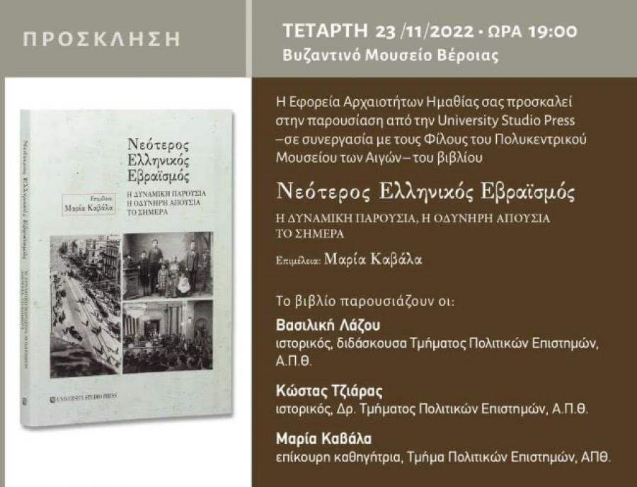Οι Φίλοι του Πολυκεντρικού Μουσείου των Αιγών και του Δικτύου του σε συνεργασία με την Εφορεία Αρχαιοτήτων Ημαθίας και τον εκδοτικό οίκο University Studio Press, σας προσκαλούν την Τετάρτη (23/11) και ώρα 19:00 στην παρουσίαση του βιβλίου της Μαρίας Καβάλα (Επ. Καθηγήτρια Πολιτικών Επιστημών Α.Π.Θ.) με τίτλο «Νεότερος ελληνικός εβραϊσμός (Η δυναμική παρουσία, η οδυνηρή απουσία, το σήμερα)», που θα πραγματοποιηθεί στο Βυζαντινό Μουσείο της Βέροιας ("Υπόγειο της Μνήμης").