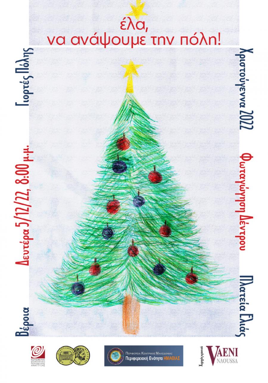 Ο δήμος Βέροιας και η ΚΕΠΑ ετοιμάζουν την γιορτή της φωταγώγησης του Χριστουγεννιάτικου Δέντρου της Βέροιας, την Δευτέρα 5 Δεκεμβρίου στην Πλατεία Ελιάς και προσκαλούν όλο τον κόσμο, σε μια βραδιά γιορτής.