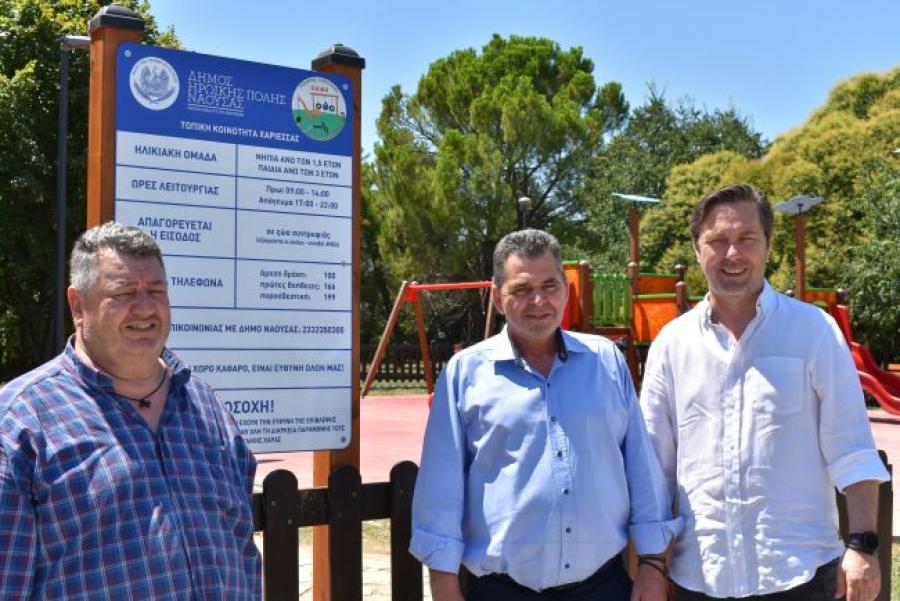 Ολοκληρώνεται η ανάπλαση και η κατασκευή σύγχρονων, πιστοποιημένων παιδικών χαρών, σε Τοπικές Κοινότητες του Δήμου Νάουσας, έργο συγχρηματοδοτούμενο από την Περιφέρεια Κεντρικής Μακεδονίας,με τη συνεργασία της Περιφερειακής Ενότητας Ημαθίας.