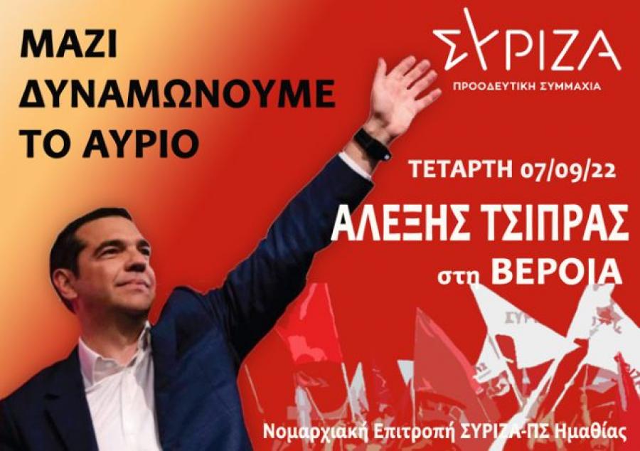 Την Τετάρτη 07/09/2022 στις 11.30 π.μ, θα επισκεφθεί την Ημαθία ο Πρόεδρος του ΣΥΡΙΖΑ-ΠΣ κι αρχηγός της Αξιωματικής Αντιπολίτευσης Αλέξης Τσίπρας. Το αναλυτικό πρόγραμμα της επίσκεψης θα ανακοινωθεί αύριο Τρίτη 06/09/2022