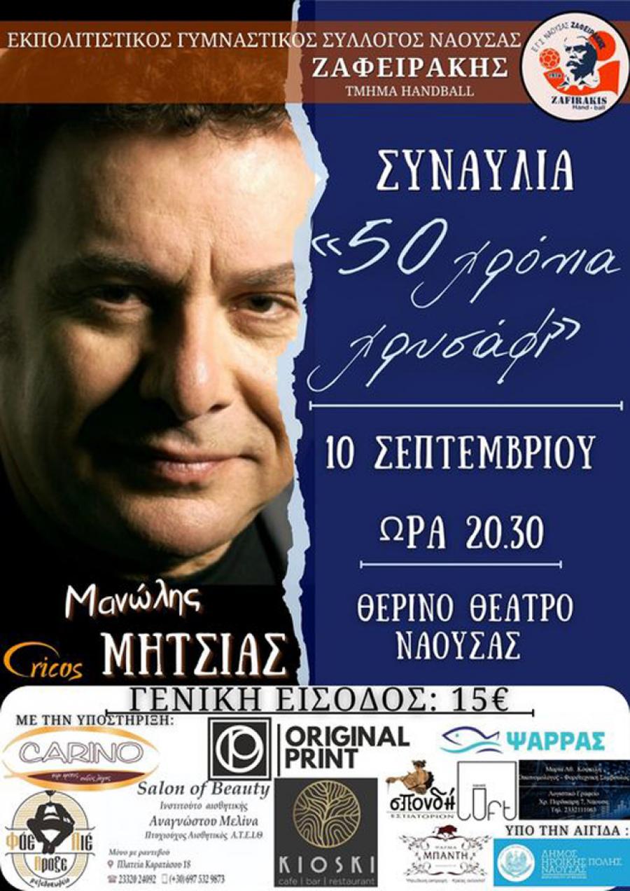 Με μεγάλη χαρά μοιραζόμαστε μαζί σας πως το τμήμα χάντμπολ του συλλόγου μας διοργανώνει συναυλία με τον σπουδαίο ερμηνευτή Μανώλη Μητσιά και τίτλο "50 χρόνια χρυσάφι"!