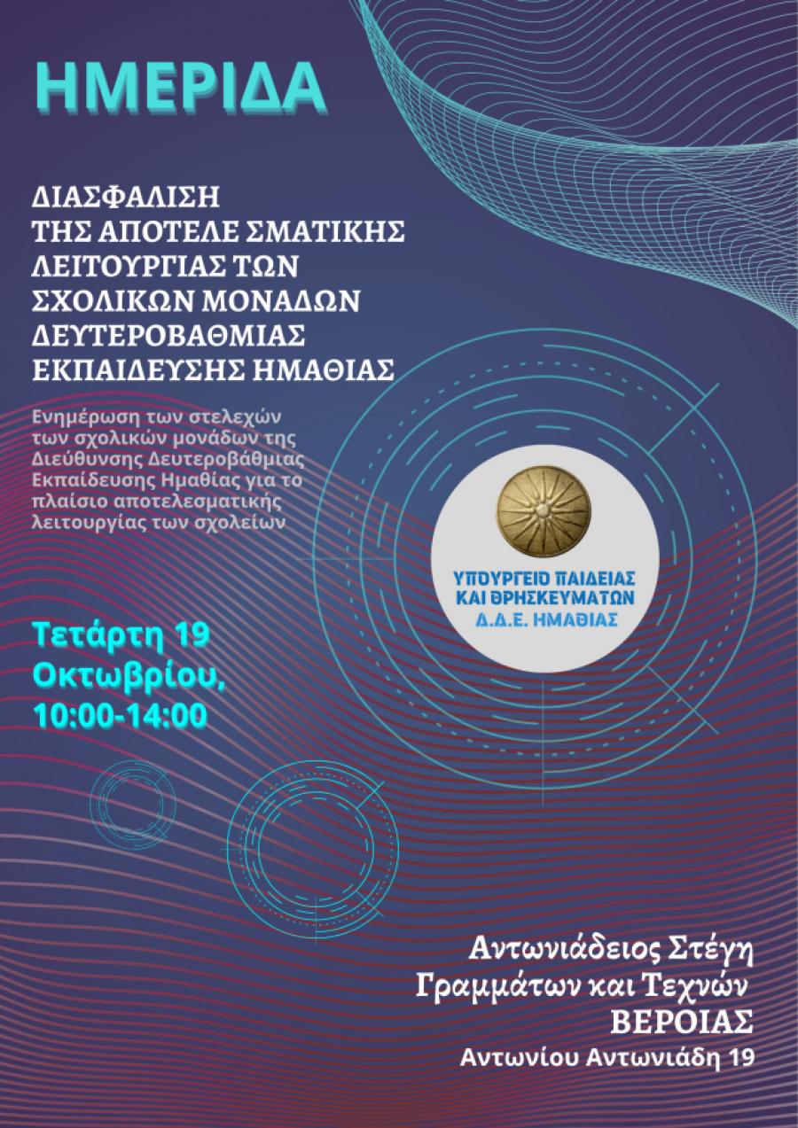 Η Διεύθυνση Δευτεροβάθμιας Εκπαίδευσης Ημαθίας διοργανώνει Ημερίδα με τίτλο «Διασφάλιση της Αποτελεσματικής Λειτουργίας των Σχολικών Μονάδων Δευτεροβάθμιας Εκπαίδευσης Ημαθίας». Στόχος της Ημερίδας είναι η ενημέρωση των Διευθυντών/-ριών και Υποδιευθυντών/-ριών) των σχολείων της Διεύθυνσης για το πλαίσιο αποτελεσματικής λειτουργίας των σχολείων.